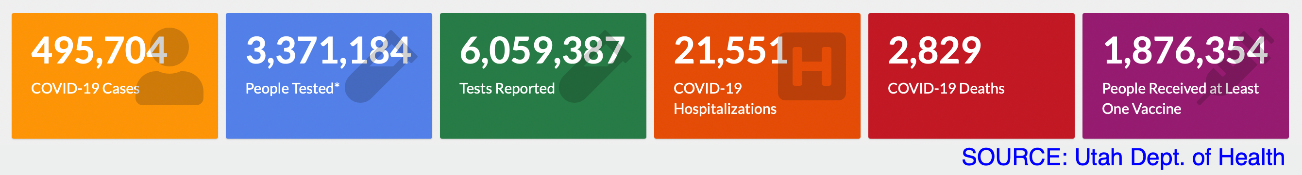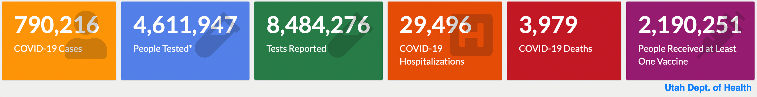 NOTE: After Thursday, March 31, 2022 Utah health officials will only update COVID-19 numbers once a week, instead of daily. This is similar to how often data on other respiratory diseases, like flu, are reported.