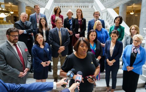 (Trent Nelson | The Salt Lake Tribune) Rep. Sandra Hollins, D-Salt Lake City, speaks, standing with other House Democrats who walked out of the House Chamber as Republicans moved to debate resolution on teaching critical race theory in Salt Lake City on Wednesday, May 19, 2021